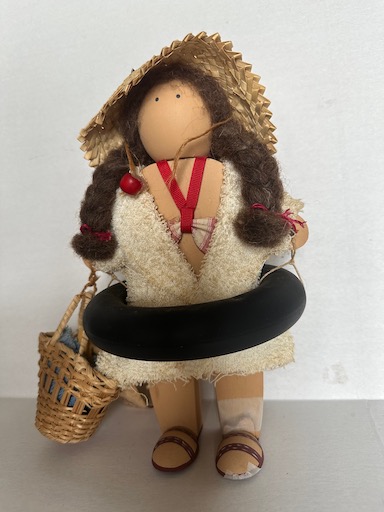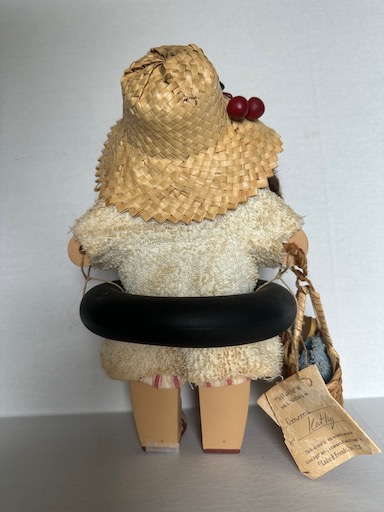 Wearing an inner tube and carrying her beach basket.
